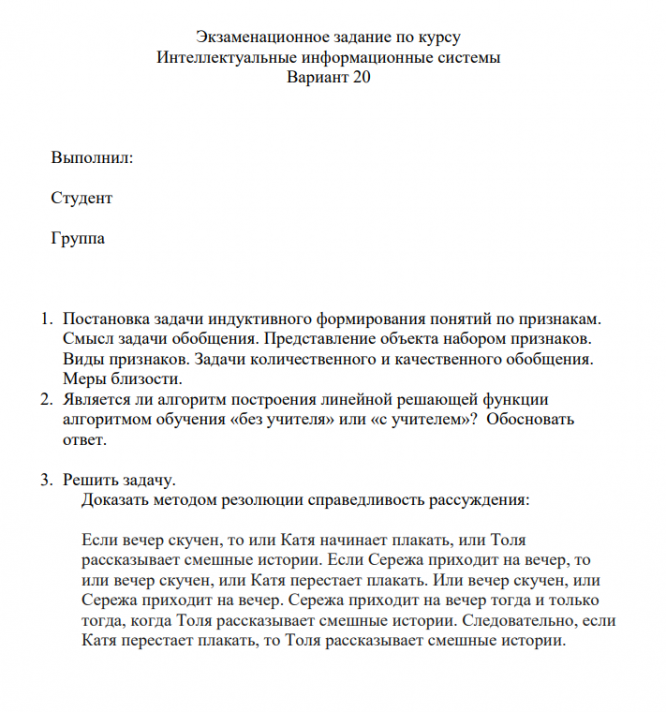 3. Решить задачу. Доказать методом резолюции справедливость рассуждения: Если вечер скучен, то или Катя начинает плакать, или Толя рассказывает смешные истории. Если Сережа приходит на вечер, то или вечер скучен, или Катя перестает плакать. Или вечер скучен, или Сережа приходит на вечер. Сережа приходит на вечер тогда и только тогда, когда Толя рассказывает смешные истории. Следовательно, если Катя перестает плакать, то Толя рассказывает смешные истории. Экзаменационное задание по курсу Интеллектуальные информационные системы Вариант 20