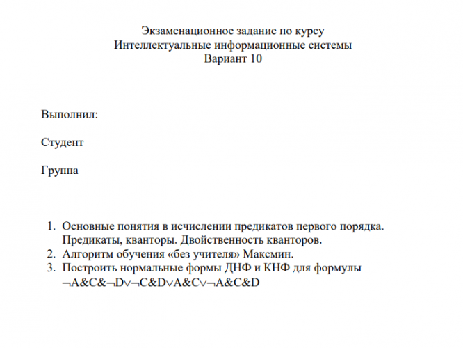 Для студентов ИДДО НИУ «МЭИ» по предмету Интеллектуальные информационные системы (ИИС)Полный курс Итоговая работа (Экзаменационное письменное задание) - Вариант 10Полный курс Итоговая работа (Экзаменационное письменное задание) - Вариант 10
