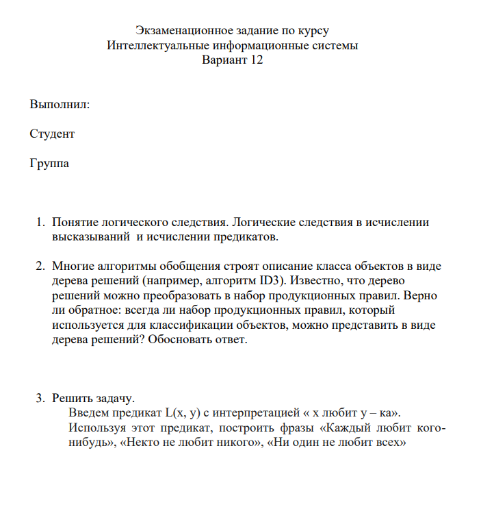 Для студентов ИДДО НИУ «МЭИ» по предмету Интеллектуальные информационные системы (ИИС)Полный курс Итоговая работа (Экзаменационное письменное задание) - Вариант 12Полный курс Итоговая работа (Экзаменационное письменное задание) - Вариант 12