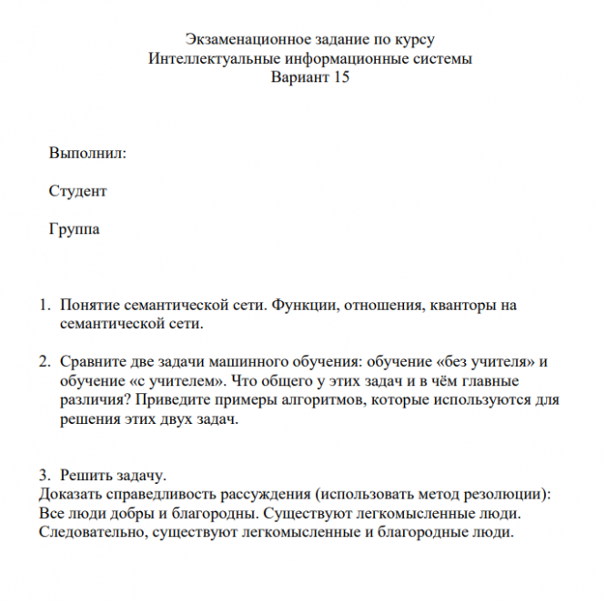 Для студентов ИДДО НИУ «МЭИ» по предмету Интеллектуальные информационные системы (ИИС)Полный курс Итоговая работа (Экзаменационное письменное задание) - Вариант 15Полный курс Итоговая работа (Экзаменационное письменное задание) - Вариант 15