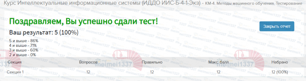 Для студентов ИДДО НИУ «МЭИ» по предмету Интеллектуальные информационные системы (ИИС)КМ-4. Методы машинного обучения. Тестирование - 100%КМ-4. Методы машинного обучения. Тестирование - 100%