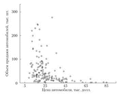Преподаватель рассказал студентом о выявлении зависимостей между непрерывными переменными. В качестве примера он привел зависимость продаж автомобилей от цены (см. рисунок ниже).