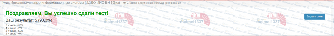 Для студентов ИДДО НИУ «МЭИ» по предмету Интеллектуальные информационные системы (ИИС)Курс Интеллектуальные информационные системы (ИИС) - КМ-2. Вывод в логических системах. Тестирование - 93,3%Курс Интеллектуальные информационные системы (ИИС) - КМ-2. Вывод в логических системах. Тестирование - 93,3%