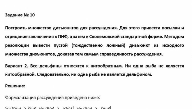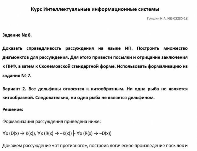 III. Доказать справедливость рассуждения (взять свой вариант из задания на исчисление высказываний) методом резолюции