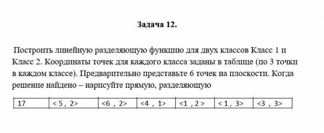 Построить линейную разделяющую функцию для двух классов Класс 1 и Класс 2. Координаты точек для каждого класса заданы в таблице (по 3 точки в каждом классе). Предварительно представьте 6 точек на плоскости. Когда решение найдено – нарисуйте прямую, разделяющую