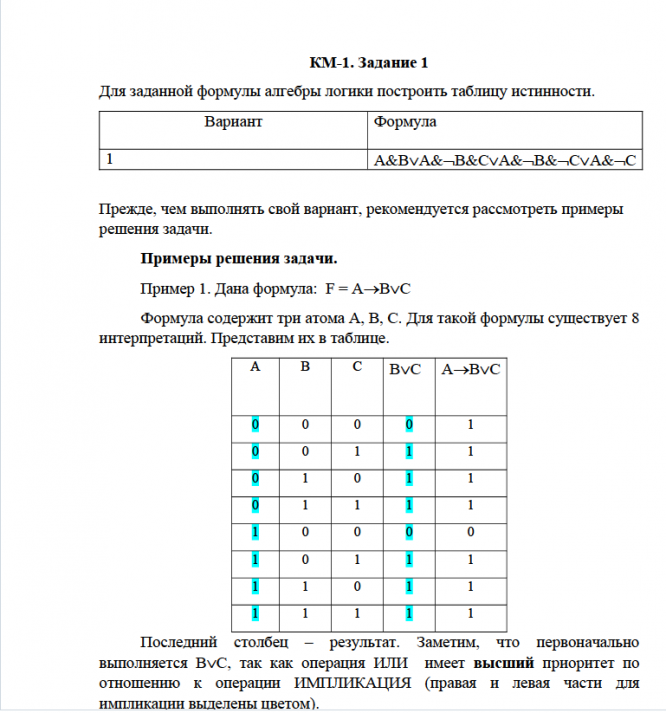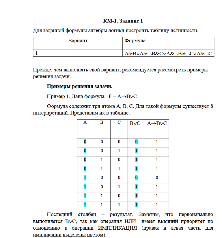 Задача: КМ-1. Алгебра логики высказываний. вариант 1