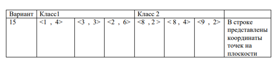 Задача КМ-3: Построить линейную разделяющую функцию для объектов двух классов Класс 1 и Класс 2 вариант 15