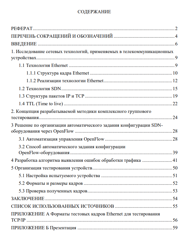 Расчетно-пояснительная записка 55 с., 13 рис., 5 табл., 8 источников. МЕТОДИКА ИСПЫТАНИЙ, ТЕЛЛЕКОМУНИКАЦИОННЫЕ УСТРОЙСТВА, ГРУППОВОЕ ИСПЫТАНИЕ, ОПТИМИЗАЦИЯ ТЕХНОЛОГИЧЕСКИХ ПРОЦЕССОВ ПРОИЗВОДСТВА, ПРОГРАММНО-ОПРЕДЕЛЯЕМЫЕ СЕТИ, ТЕСТИРОВАНИЕ ОБОРУДОВАНИЯ, SDN, OPENFLOW Объектом исследования является технологический процесс выходного контроля качества телекоммуникационного оборудования специального назначения, обеспечивающего функционирование в магистрально-опорных и распределено-опорных программно-определяемых сетях и линиях связи. Цель работы – исследование сетевых технологий и методов контроля качества испытуемого оборудования с целью оптимизации процессов производства в части касающейся функционирования в программно-определяемых сетях. В результате работы было проведено исследование методик и оценка возможности реализации проведения комплексного группового тестирования телекоммуникационного оборудования с целью оптимизации быстродействия. Оптимизация процессов выходного контроля специального сетевого оборудования является актуальной. Реализация результатов позволит повысить экономическую эффективность производства. В расчетно-пояснительной записке был проведен анализ алгоритмов выявления ошибок обработки трафика, разработка собственного более эффективного алгоритма, а также исследование методик и технологий, используемых при проведении комплексного группового тестирования телекоммуникационного оборудования. В работе был описан способ организации тестирования устройств.