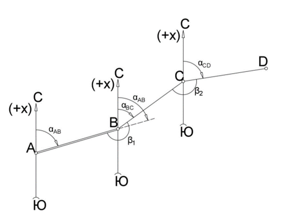 ЗАДАЧА 1.1. Вычислить дирекционные углы линий ВС и СД, если известен дирекционный линии АВ и измеренные правые по ходу углы β1 и β2 (см. рис.1).