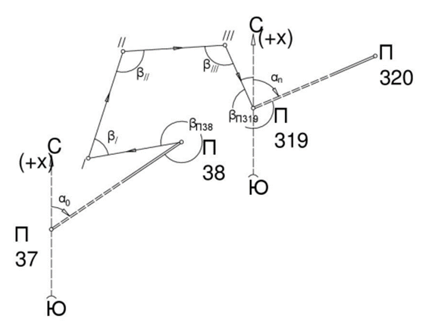 Известны также исходный α0 и конечный αn дирекционные углы: