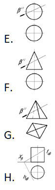 ниже) в следующем порядке: скрещивающиеся прямые, прямая не лежит в плоскости, прямая пересекает плоскость, прямая параллельная плоскости: 1 2 3 4 Проставьте название фигур и их изображение (см. ниже) в следующем порядке: цилиндрическая поверхность, призматическая поверхность, торовая поверхность: 1 2 3 Проставьте последовательно определения в следующем порядке: прямая пересекает конус, прямая пересекает шар, прямая не пересекает конус, прямая не пересекает шар: 1 2 3 4 Проставьте последовательность определения с изображением в следующем порядке: схема, эскиз, условное обозначение, чертеж (см. рисунок ниже): 1 2 3 4 Проставьте правильное соотношение название видов и их изображения (см.