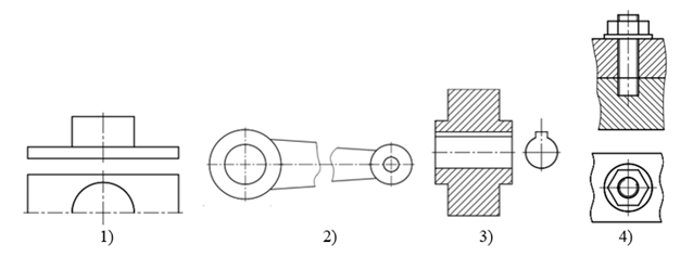 произвольно расположенными с горизонтально расположенной осью вращения с вертикально расположенной осью вращения с осью вращения под прямым углом к основной надписи На рисунке представлен… фронтальный разрез вид слева горизонтальный разрез дополнительный вид Неверно, что в соответствии с требованиями ГОСТ ЕСКД на чертеже используется масштаб... 12 13 15 12,5 Для изображения предметов на чертежах используется метод… перспективного удаления прямоугольного проецирования технического редактирования пространственного представления Установите в правильной последовательности выполнение трех основныз видов детали по ее аксонометрической проекции 1 вычерчивание главного вида (вида спереди) 2 вычерчивание вида сверху под главным видом в проекционной связи 3 анализ детали и определение главного вида 4 построение в проекционной связи вида слева 5 простановка размеров на изображениях 6 обводка изображений На рисунке показано … болтовое соединение сварное соединение заклепочное соединение винтовое соединение Установите в правильной последовательности выполнение чертежа детали 1 выбор масштаба 2 вычерчивание осей и центров 3 вычерчивание контуров 4 вычерчивание внутренних элементов 5 расстановка размеров 6 нанесение надписей 7 обводка контуров .