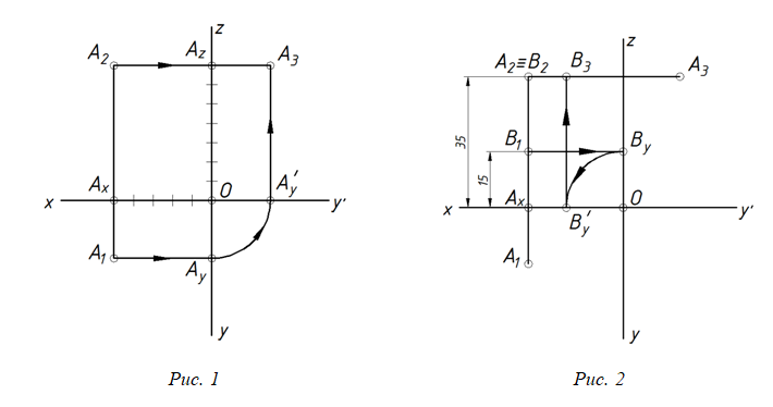 Пример решения. Отмечаем на оси х точку Ах, удаленную от начала координат влево на расстояние 25 мм. Через Ах проводим, перпендикулярную к оси прямую и откладываем на ней отрезки Ах А1 и Ах А2 соответственно равные 15 и 35 мм. Положение профильной проекции точки А3 находим с помощью А1 и А2. Пример выполнения задачи показан на рис.1.