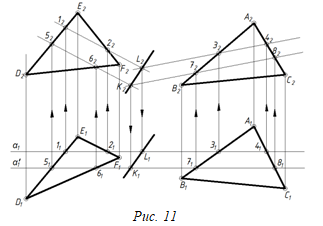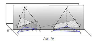Пример решения. На рис. 10 показан прием решения поставленной задачи, заключающийся в использовании вспомогательных секущих плоскостей. Одна такая плоскость – горизонтально проецирующая α' пересекает две данные плоскости (треугольники АВС и DEF) по прямым линиям 5-6 и 7-8. Точка к пересечения этих прямых является общей для двух плоскостей.
