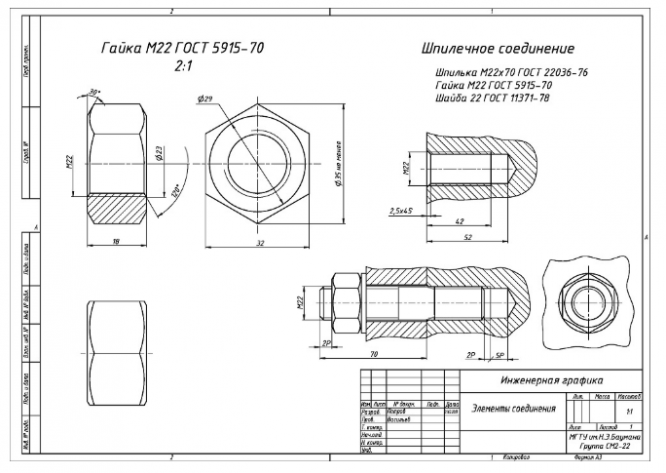 Для студентов МГТУ им. Н.Э.Баумана по предмету Инженерная графикаВариант 10 - Шпилечное соединениеВариант 10 - Шпилечное соединение