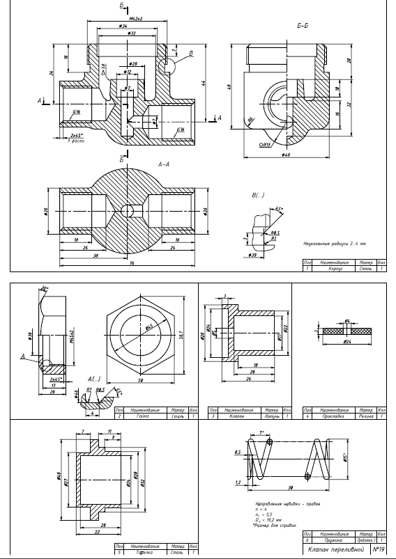 Клапан переливной, вариант 19. Все детали и корпус(Чертежи и 3д модели). Модель сборки, чертеж сборки готовый. Спецификация. Инвентор 2021