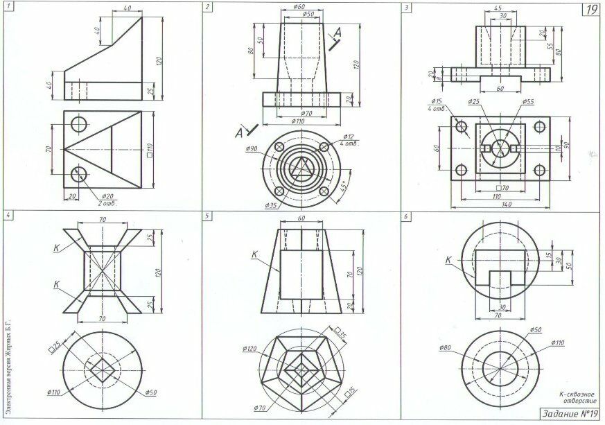 В файле зачтенные 6 чертежей по инженерной графике для 19 варианта. К каждому чертежу идет комплект ( 1 чистовик и 1 черновик с точками) . Очень аккуратно начерченные чертежи . В номере 2 на черновике еще сделано выносное сечение. Условие для 19 варианта ниже