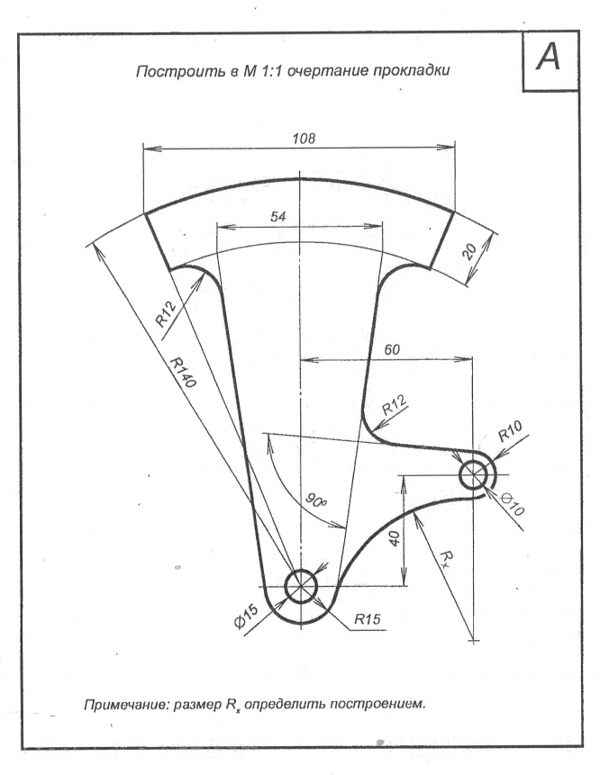 Чертеж детали А из комплекта заданий по инженерной графике для 2 семестра. На чертеже обозначены вспомогательные линии, используемые при построении изображения, а также проставлены необходимые для построения размеры. Задание ![]()