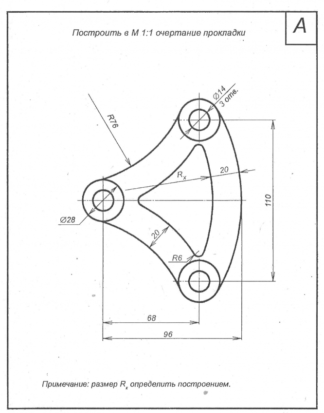 Чертеж детали А из комплекта заданий по инженерной графике для 2 семестра. На чертеже обозначены вспомогательные линии, используемые при построении изображения, а также проставлены необходимые для построения размеры. Чертеж можно сразу перечерчивать на ватман.