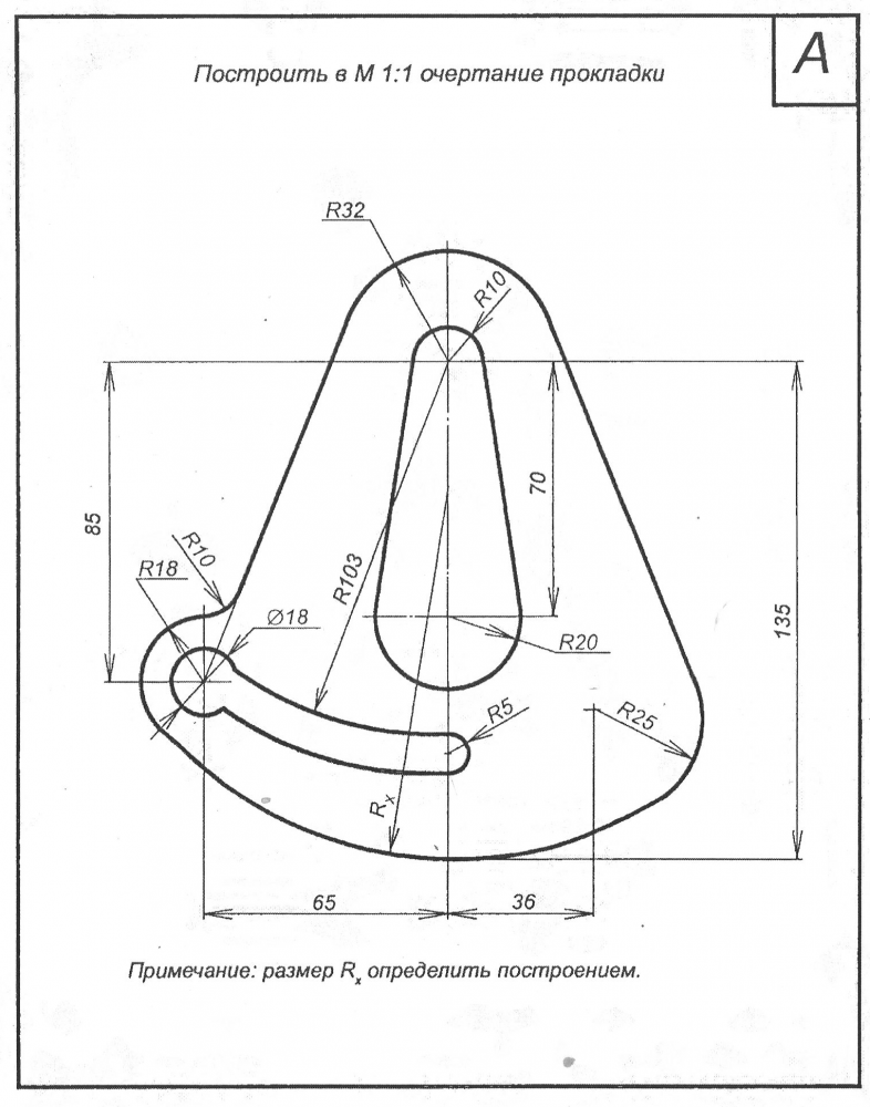 Чертеж детали А из комплекта заданий по инженерной графике для 2 семестра. На чертеже обозначены вспомогательные линии, используемые при построении изображения, а также проставлены необходимые для построения размеры. Чертеж можно сразу перечерчивать на ватман.
