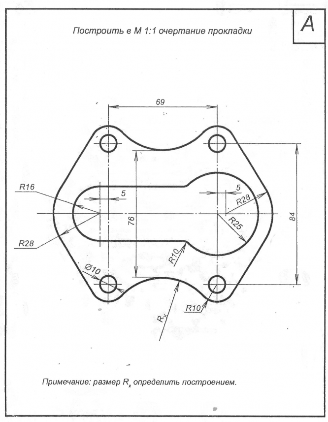 Чертеж детали А из комплекта заданий по инженерной графике для 2 семестра. На чертеже обозначены вспомогательные линии, используемые при построении изображения, а также проставлены необходимые для построения размеры. Чертеж можно сразу перечерчивать на ватман.