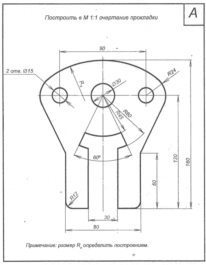 Чертеж детали А из комплекта заданий по инженерной графике для 2 семестра. На чертеже обозначены вспомогательные линии, используемые при построении изображения, а также проставлены необходимые для построения размеры. Чертеж можно сразу перечерчивать на ватман.