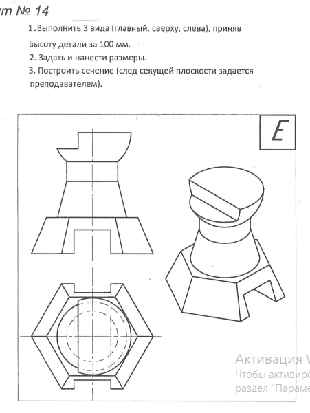 В архиве - 3D модель и чертеж детали Е из комплекта заданий по инженерной графике для 2 семестра. Размеры сняты с изображения, приведённого в условии задания. Чертеж из pdf-файла можно сразу переносить на ватман.