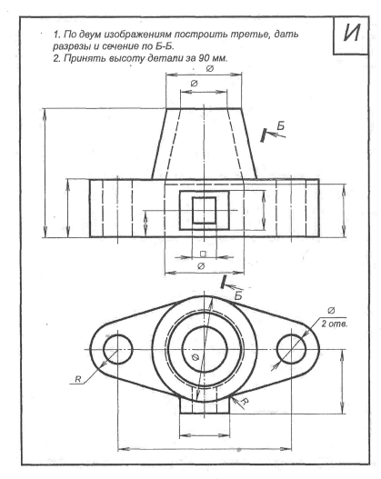 В архиве - 3D модель и чертеж детали И из комплекта заданий по инженерной графике для 2 семестра. Размеры сняты с изображения, приведенного в условии задания. Чертеж из pdf-файла можно сразу переносить на ватман.