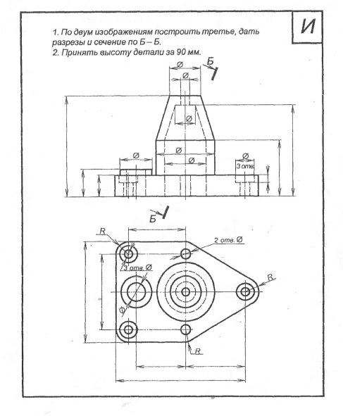 В архиве - 3D модель и чертеж детали И из комплекта заданий по инженерной графике для 2 семестра. Размеры сняты с изображения, приведенного в условии задания. Чертеж из pdf-файла можно сразу переносить на ватман.