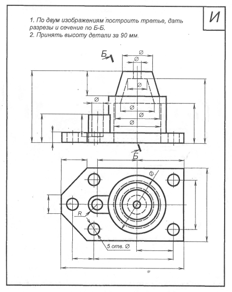 В архиве - 3D модель и чертеж детали И из комплекта заданий по инженерной графике для 2 семестра. Размеры сняты с изображения, приведенного в условии задания. Чертеж из pdf-файла можно сразу переносить на ватман.