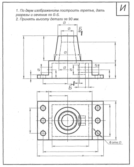 В архиве - 3D модель и чертеж детали И из комплекта заданий по инженерной графике для 2 семестра. Размеры сняты с изображения, приведенного в условии задания. Построено сечение заданной в условии плоскостью. Чертеж из pdf-файла можно сразу переносить на ватман.