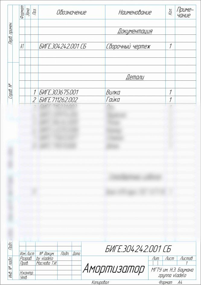Сборочный чертеж и спецификация амортизатора №23 в Компас 3D