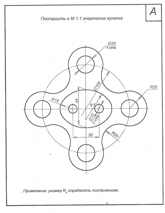 Чертеж детали А из комплекта заданий по инженерной графике для 2 семестра. На чертеже обозначены вспомогательные линии, используемые при построении изображения, а также проставлены необходимые для построения размеры. Чертеж можно сразу перечерчивать на ватман.