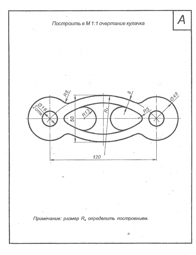 Чертеж детали А из комплекта заданий по инженерной графике для 2 семестра. На чертеже обозначены вспомогательные линии, используемые при построении изображения, а также проставлены необходимые для построения размеры. Чертеж можно сразу перечерчивать на ватман.