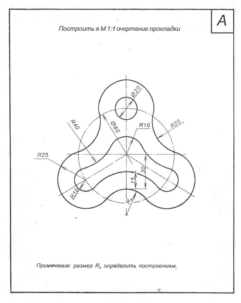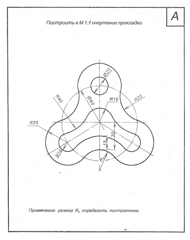 Чертеж детали А из комплекта заданий по инженерной графике для 2 семестра. На чертеже обозначены вспомогательные линии, используемые при построении изображения, а также проставлены необходимые для построения размеры. Чертеж можно сразу перечерчивать на ватман.