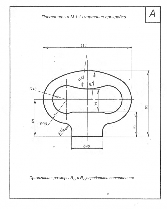 Чертеж детали А из комплекта заданий по инженерной графике для 2 семестра. На чертеже обозначены вспомогательные линии, используемые при построении изображения, а также проставлены необходимые для построения размеры. Чертеж можно сразу перечерчивать на ватман.