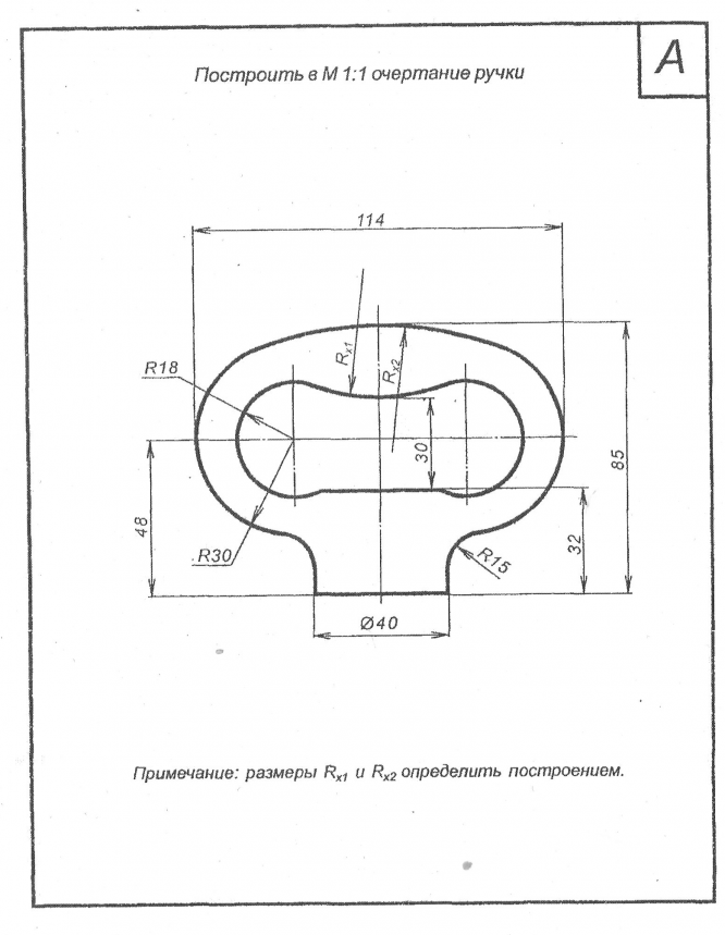 Чертеж детали А из комплекта заданий по инженерной графике для 2 семестра. На чертеже обозначены вспомогательные линии, используемые при построении изображения, а также проставлены необходимые для построения размеры. Чертеж можно сразу перечерчивать на ватман.