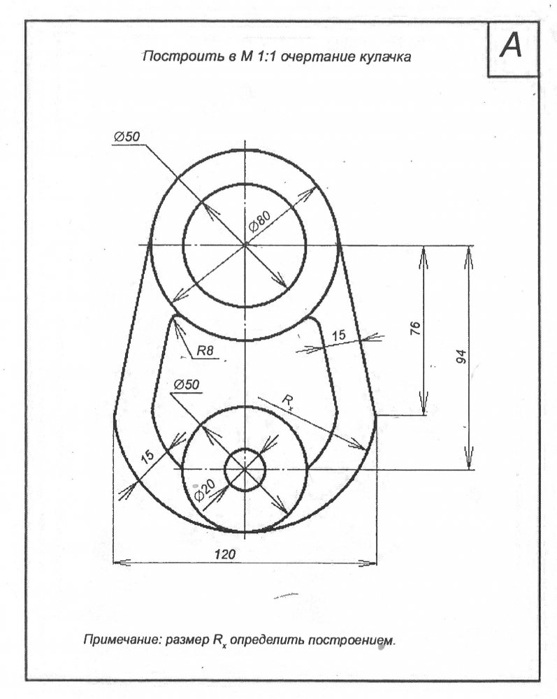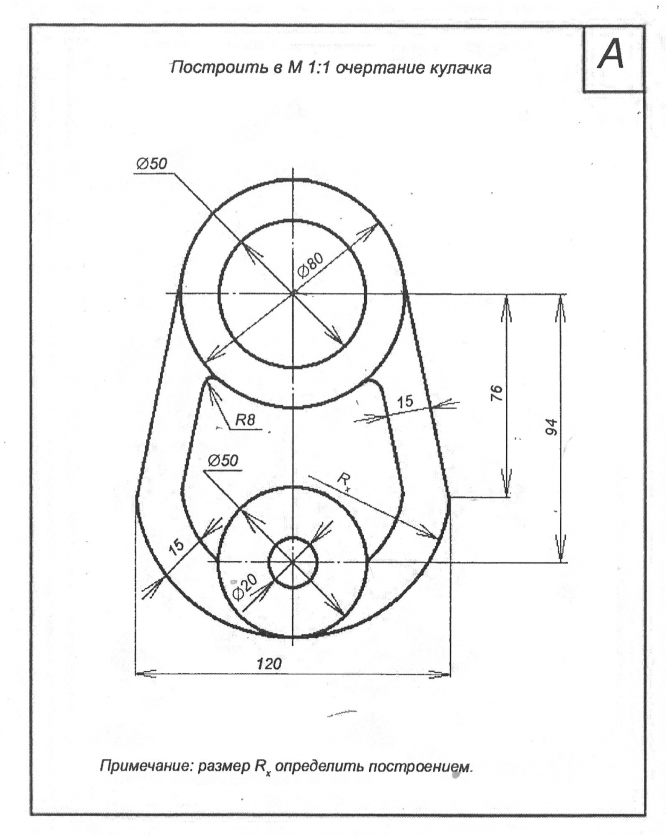 Чертеж детали А из комплекта заданий по инженерной графике для 2 семестра. На чертеже обозначены вспомогательные линии, используемые при построении изображения, а также проставлены необходимые для построения размеры. Чертеж можно сразу перечерчивать на ватман.