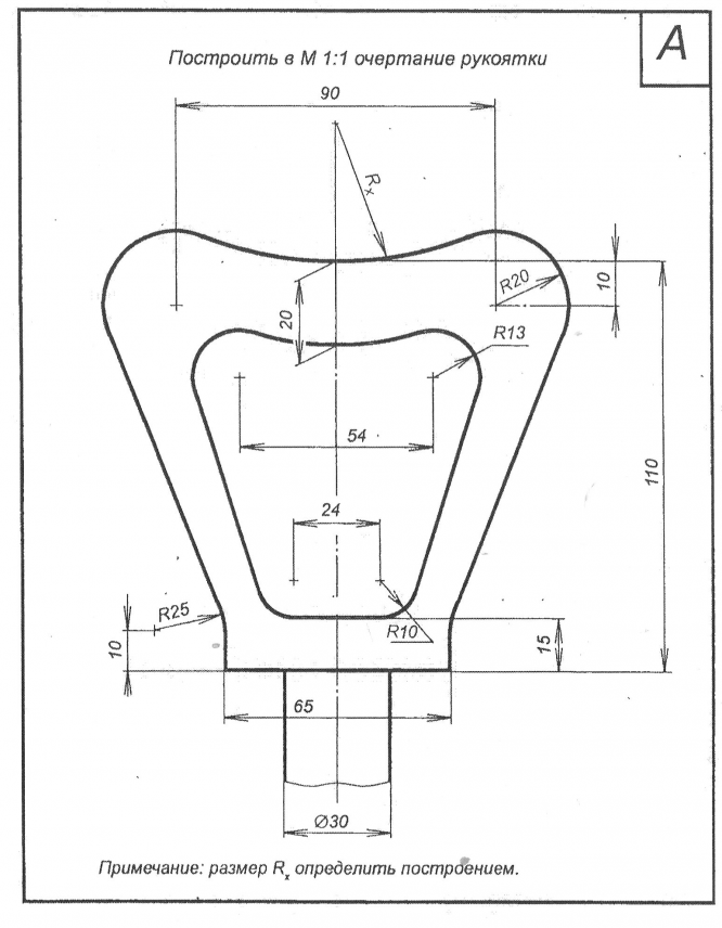 Чертеж детали А из комплекта заданий по инженерной графике для 2 семестра. На чертеже обозначены вспомогательные линии, используемые при построении изображения, а также проставлены необходимые для построения размеры. Чертеж можно сразу перечерчивать на ватман.