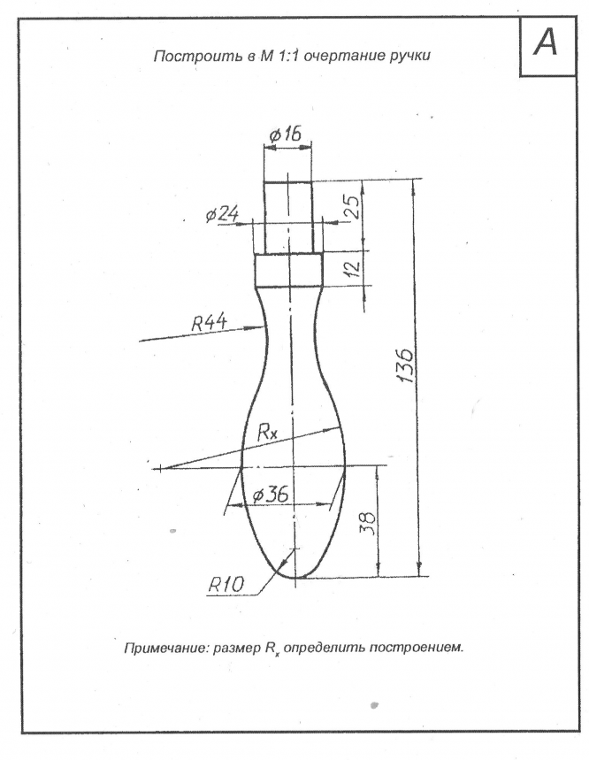 Чертеж детали А из комплекта заданий по инженерной графике для 2 семестра. На чертеже обозначены вспомогательные линии, используемые при построении изображения, а также проставлены необходимые для построения размеры. Чертеж можно сразу перечерчивать на ватман.