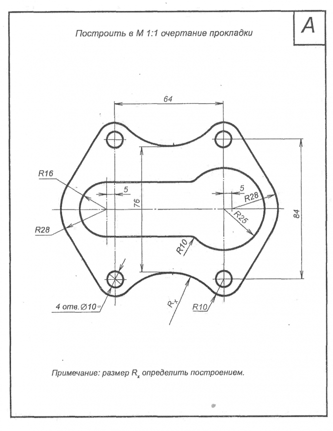 Чертеж детали А из комплекта заданий по инженерной графике для 2 семестра. На чертеже обозначены вспомогательные линии, используемые при построении изображения, а также проставлены необходимые для построения размеры. Чертеж можно сразу перечерчивать на ватман.