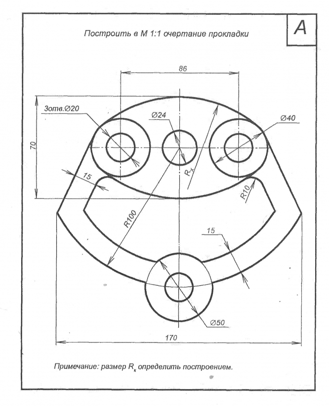 Чертеж детали А из комплекта заданий по инженерной графике для 2 семестра. На чертеже обозначены вспомогательные линии, используемые при построении изображения, а также проставлены необходимые для построения размеры. Чертеж можно сразу перечерчивать на ватман.