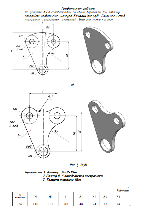 В архиве - чертеж детали "Качалка", построенный согласно данным варианта. Даны вспомогательные линии для построения сопряжений, для удобства отмеченные цветом (на каждое сопряжение - свой цвет) и точки касания. Чертеж можно сразу переносить на ватман.