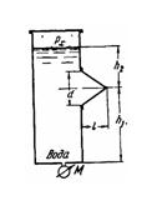 Задача (Куколевский И.И.) 3-3. Показание манометра, присоединенного к днищу бака, равно M = 10 кПа. Найти давление воздуха, находящегося над водой, если h1 = 1,8 м и h2 = 1 м.