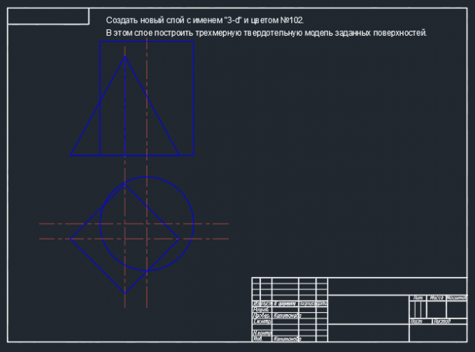 • ИГР-4 - Создать новый слой с именем "3-d" и цветом №102. В этом слое построить трехмерную твердотельную модель заданных поверхностей.