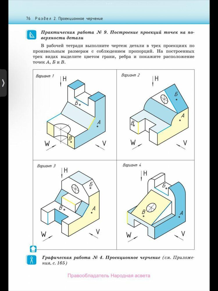 Вариант 1 . Для тех кто совсем не разбирается в черчении. Задание выполнено в электронном виде. Только распечатайте и готово. Выполнено по заданию в цвете, показаны точки, грани и ребра.