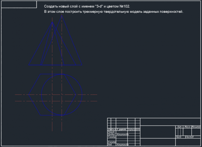 • ИГР-4 - Создать новый слой с именем "3-d" и цветом №102. В этом слое построить трехмерную твердотельную модель заданных поверхностей.