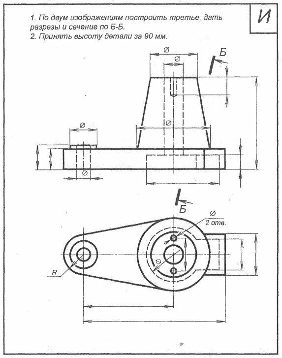 • На чертеже представлены 3 вида детали и примерный вид сечения плоскостью Б-Б (положение плоскости задано в условии).