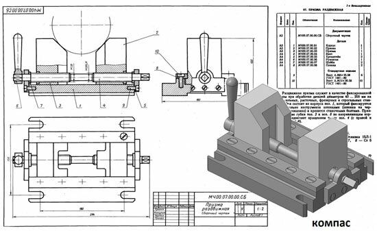 Раздвижная призма служит в качестве фиксированной опоры при обработке деталей диаметром 40 ... 200 мм на сверлильных, расточных, фрезерных и строгальных станках. Она состоит из корпуса поз. 1, который фиксируется относительно инструмента шпонками (шпонка на чертеже не показана) и крепится станочными болтами. Призматические губки поз. 2 и поз. 3 по направляющим корпуса передвигают вращением винта поз. 4 (с правой и левой резьбой). Призма раздвижная МЧ00.07.00.00 сборочный чертеж