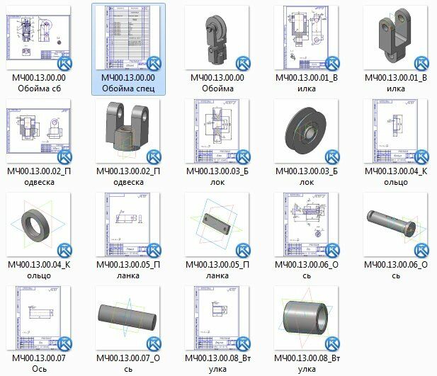 Обойма применяется в грузоподъемных механизмах. Трос (на чертеже не показан) грузоподъемного механизма охватывает блок поз. 3, в которой запрессована сменная втулка поз. 8. Блок поз. 3 вращается на оси поз. 6. Внутри оси имеются каналы, которые через отверстие, закрытое винтом поз. 11, заполняются густой смазкой. Опорой оси поз. 6 является вилка поз. 1, соединенная осью поз. 7 с подвеской поз. 2 и вращающаяся вокруг этой оси. В резьбовое отверстие подвески поз. 2 ввинчивают грузоподъемный крюк (на чертеже не показан). Обойма МЧ00.13.00.00 сборочный чертеж